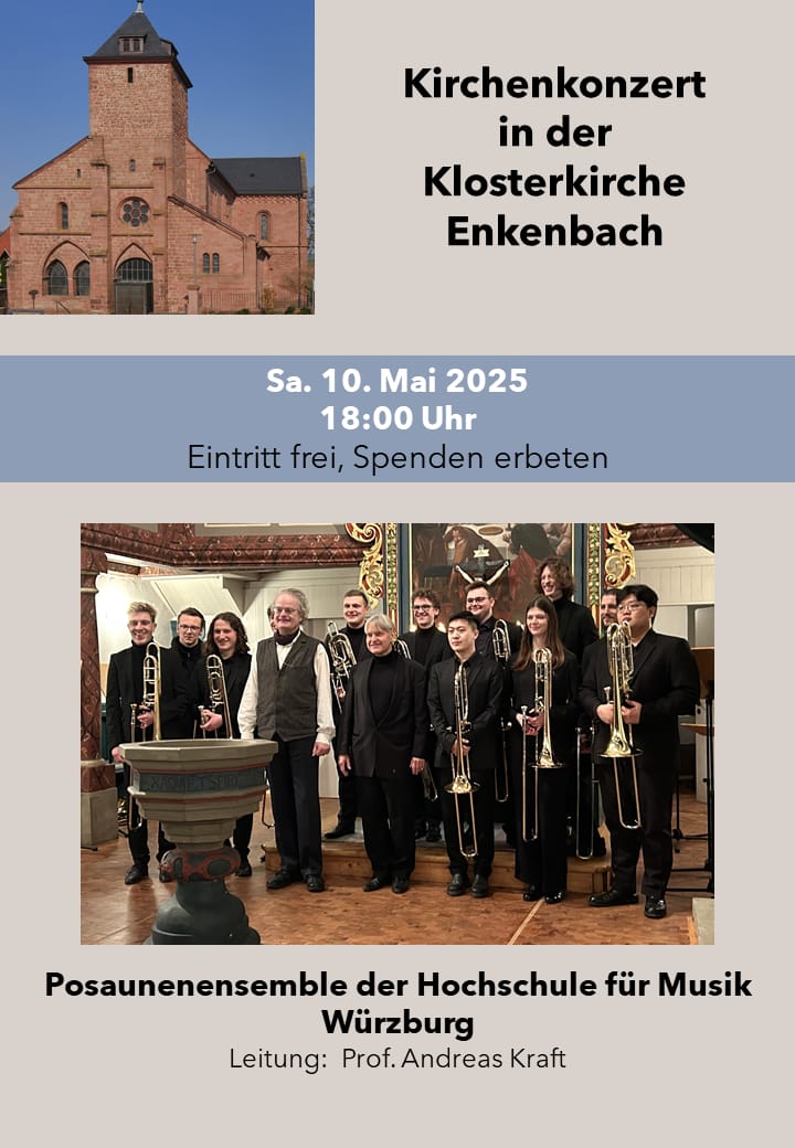 Wie in den vergangenen Jahren freuen wir uns das Posaunenemsemble der Hochschule für Musik Würzburg unter der Leitung von Prof. Andreas Kraft begrüßen zu dürfen. Es erklingen Originalwerke der Posaunenliteratur und Bearbeitungen bekannter Werke von Faure bis Wagner.
